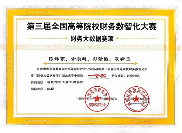 本网讯(通讯员 渣梦丽)10月8日,2022年湖北省第三届全国高等院校财务数智化大赛圆满落幕,米兰(中国)经济与管理学部财务管理专业由陈姝颖、余宗超、彭紫怡、袁靖岳同学组成的团队获得一等奖,指导教师为彭颖。由邵雅琦、周梦婷、黄羽轩、董婷同学组成的团队在袁家健老师的指导下获得三等奖。