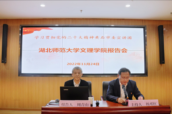 会议邀请到黄石市学习贯彻党的二十大精神市委宣讲团成员周青山教授来校专题宣讲二十大精神。周青山教授以《全面建设社会主义现代化国家的行动纲领》为题,以二十大主题为纲,从深刻领会过去5年工作和新时代10年伟大变革、深刻领会开辟马克思主义中国化时代化新境界、深刻领会中国式现代化的中国特色和本质要求、深刻领会全面建设社会主义现代化国家的重大战略部署、深刻领会坚持党的全面领导以及全面从严治党等五个方面,分别阐释了全面建设社会主义现代化国家的基础条件、指导思想、路径方式、战略部署和领导力量。报告重点突出、脉络清晰、生动形象、切合实际,对我们更准确的理解和全面把握党的二十大精神具有重要的指导意义。