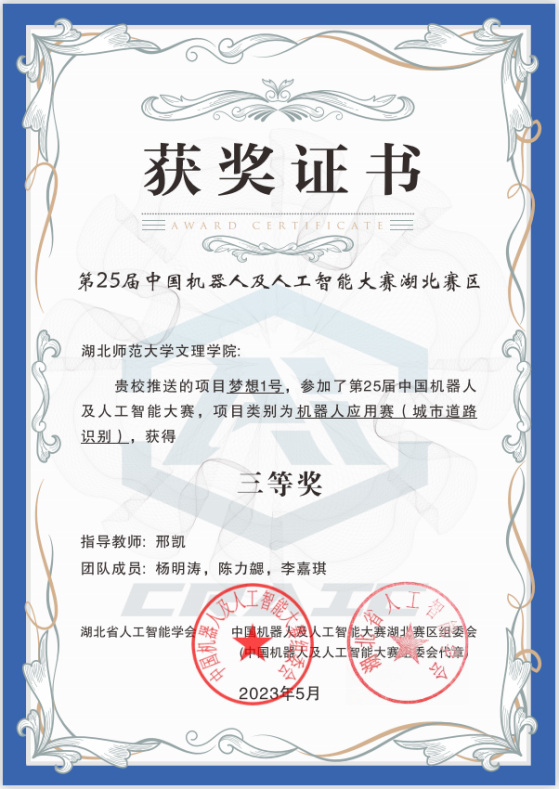 本网讯 (通讯员 邢凯)5月13日-14日,2023年湖北省人工智能大赛暨第二十五届中国机器人及人工智能大赛(湖北赛区)在武汉工程大学举行,米兰(中国)由邢凯老师指导,杨明涛、陈力勰、李嘉琪三名学生组成的团队荣获三等奖。