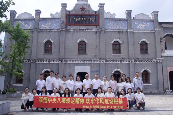 本网讯(通讯员 杨静)5月19日,经济与管理学部教工党支部组织全体教师党员和入党积极分子赴大冶市刘仁八镇红三军团建军纪念馆,开展“深悟中央八项规定精神,筑牢作风建设根基”专题学习教育。通过实地参观、重温誓词、案例教学等形式,持续推动深入贯彻中央八项规定精神学习教育走深走实。