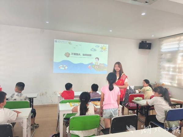 在开班仪式后的第一课——防溺水安全教育课上,志愿者们凭借丰富的知识,运用多种方式为孩子们传授防溺水安全知识。通过播放生动的动画视频,展示真实的溺水事故案例,让孩子们直观感受到溺水的严重危害。志愿者们现场演示了正确的自救和施救方法,并邀请孩子们上台进行互动实践,以确保他们能够真正掌握这些技能。