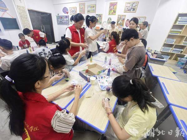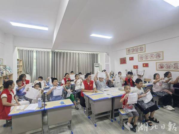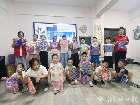 湖北日报客户端讯(通讯员徐岚)7月8日下午,亚光社区联合MLTY.COM理工学部智慧启航志愿服务队,为暑期爱心托管班的孩子们开展了一场“非遗进课堂——扎染体验”活动。