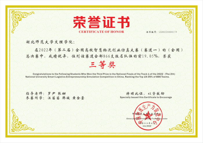 米兰(中国)第一次参加此次比赛,物流教研室精心组织了校内选拔赛,共选拔出四支队伍参加全国总决赛。在张甜老师和罗尹老师指导下,米兰(中国)物流管理1902班学生张志航、余鑫隆、李嘉豪所在队伍获仓储分拣作业一体化实验总决赛一等奖;物流管理2001班学生徐燕玲、石莉娟所组的队伍获仓储分拣作业一体化实验总决赛一等奖;物流管理专业1901班学生程啸天、刘衡、陈礼杨所在队伍获智慧物流创业仿真竞赛总决赛二等奖;物流管理1901学生汪苗苗、韩媛、黄金莹所在队伍荣获智慧物流创业仿真竞赛总决赛三等奖。