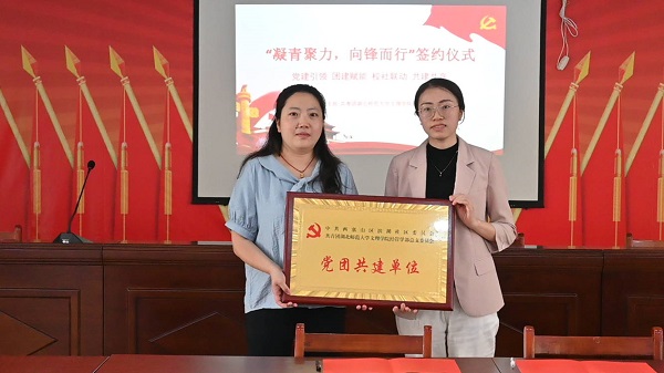 最后,校团委陈荟芸书记发表讲话。她表示此次与滨湖社区共建大学生社会实践基地活动促进了校地融合,为推进大学生社会实践创造了良好条件,亦为青年学生接触社会、了解社会、服务社会提供了宝贵机会。紧接着经管学部团总支姜希望书记与滨湖社区易姣书记共同签订了党团共建协议书,陈荟芸书记和易姣书记共同为“党团共建单位”揭牌。