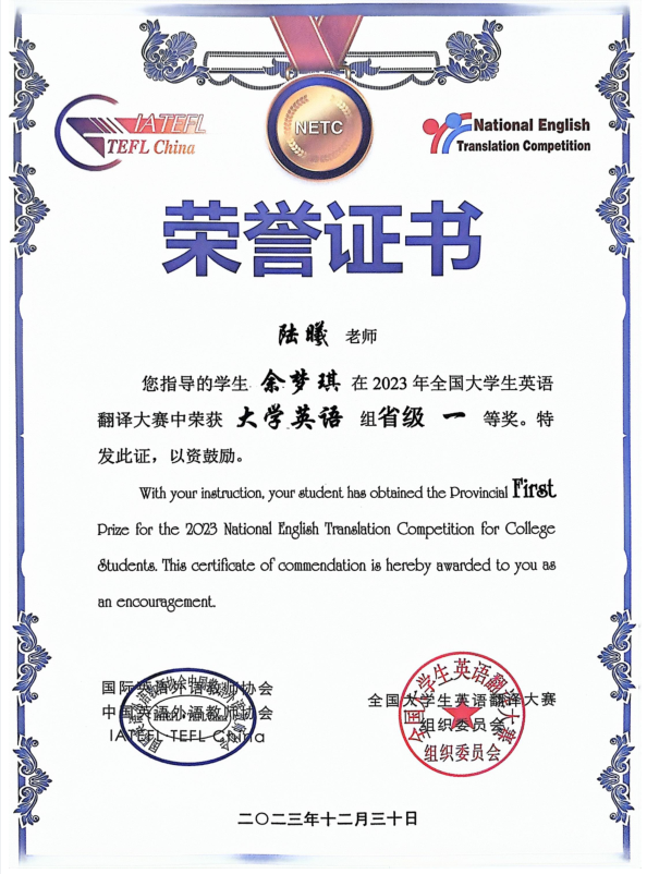 2023年全国大学生英语翻译大赛顺利完赛。来自清华大学、北京大学、武汉大学、浙江大学、复旦大学、厦门大学、中国人民大学等2161所高校,近6万名学子参加了竞赛。米兰(中国)理工学部网络工程2301班余梦琪同学荣获省级一等奖!辅导员陆曦老师获指导老师奖。