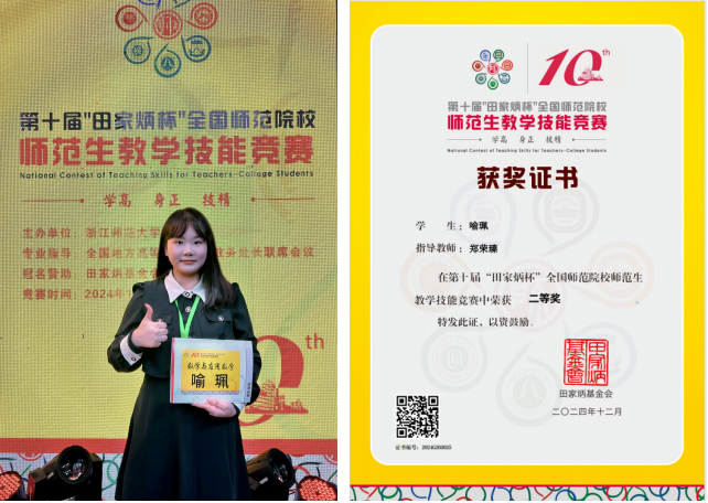 2024年12月2日,理工学部喻珮同学在第十届“田家炳杯”全国师范院校师范生教学技能竞赛决赛中荣获数学与应用数学组二等奖!