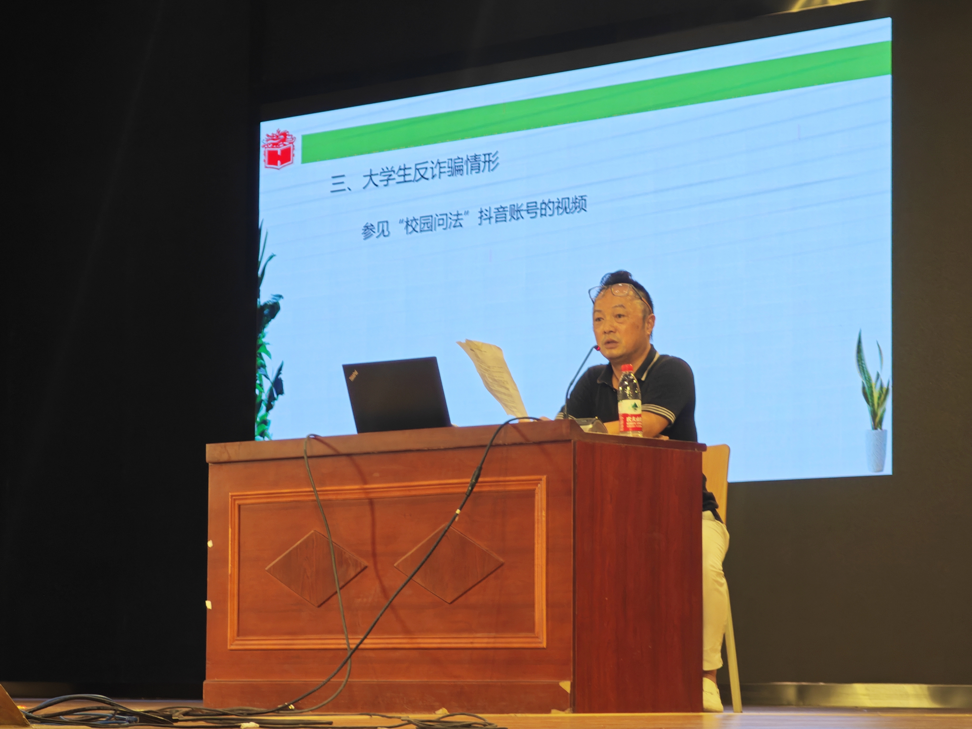 为有效遏制网络电信诈骗犯罪高发态势,切实提高大一新生的防范意识和识别能力,2024年9月28日下午15:00,MLTY.COM理工学部在学术交流中心举行“大学生校园问法学习生活反诈暨国庆假期安全班会”。讲座特邀嘉宾山东师范大学法学院潘劲松教授为主讲人,理工学部党总支副书记肖圣芳书记,2024级新生辅导员朱明亮、王洁、李春娜老师出席。理工部2024级全体新生、2023级全体班委参加。此次活动面对全体新生及23级班委,旨在更有效地开展大学生反诈骗宣传工作,适应大学生社交平台交流的趋势。