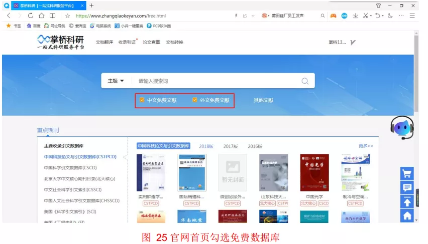 步骤一:PC 端访问掌桥科研高校服务网站:https://www.zhangqiaokeyan.com/free.html,勾选“中文免费文献”或“外文免费文献”,点击到达免费数据库页面 。