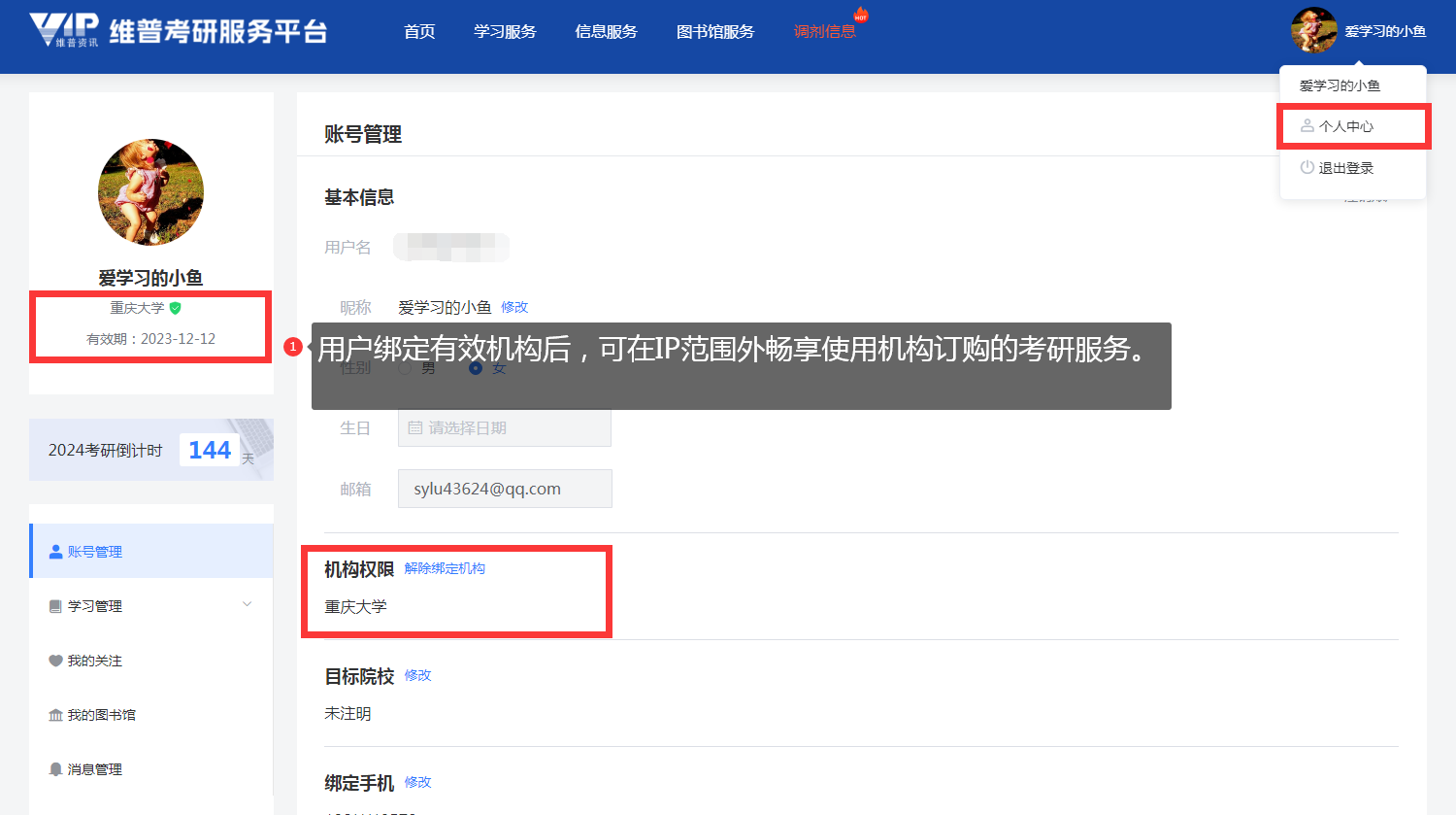 有效机构IP范围内,平台首页会显示机构名称,个人账号登录“个人中心”可查看自己绑定的机构权限及账号有效期。新版本支持用户在机构IP范围内更新个人账号有效期,支持已绑定机构权限的有效用户账号在机构IP范围外登录访问平台提供的考研服务。