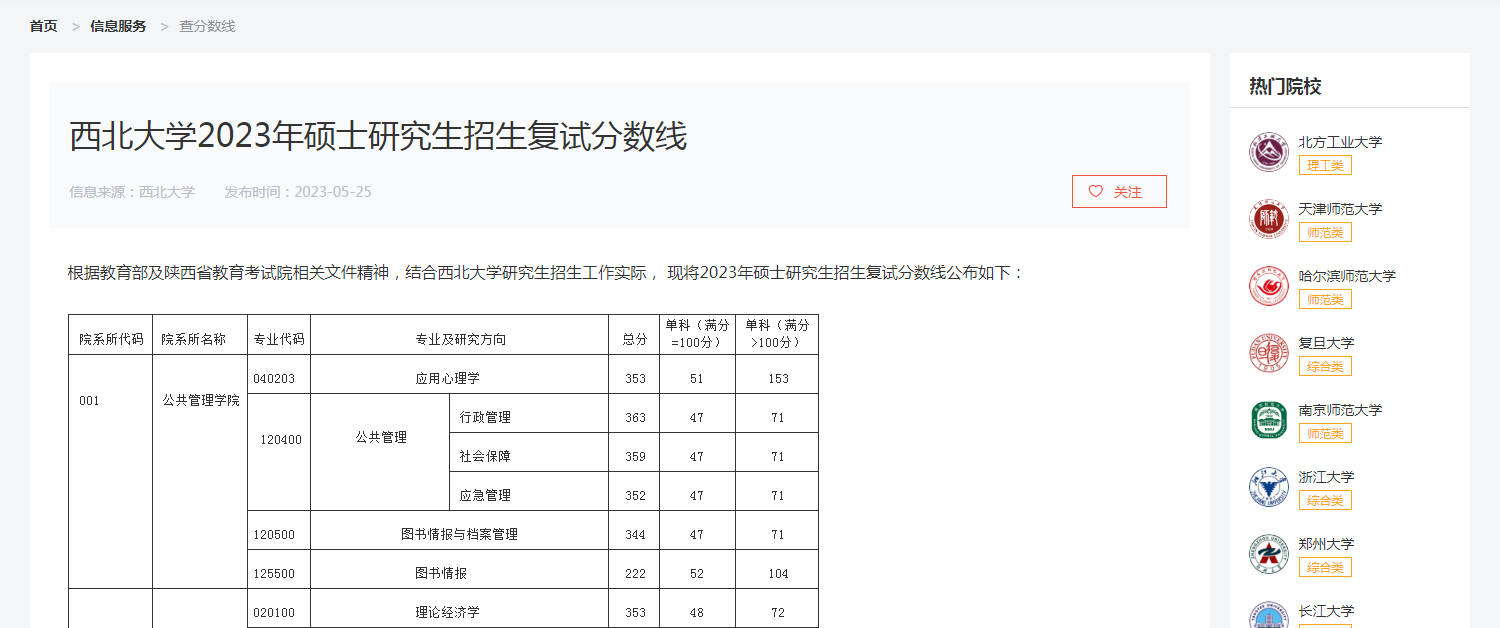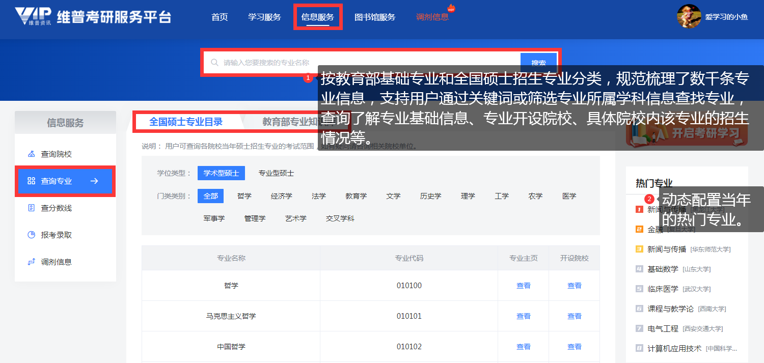 新平台的“信息服务”版块,涵盖的资讯信息贯穿了考研前后整条时间线的重要节点,资讯类型分类全面且规范合理,内容包含有关考研大环境的“热点资讯”,如国家政策、考研动态、国家分数线,以及涉及具体院校的“院校招生”信息,如院校公告、招生简章、考试大纲、参考书目、报考录取、院校分数线、调剂信息等。其中还单独加工了当年的调剂信息,提供用户通过院校或专业名称搜索查询当年的调剂专业。