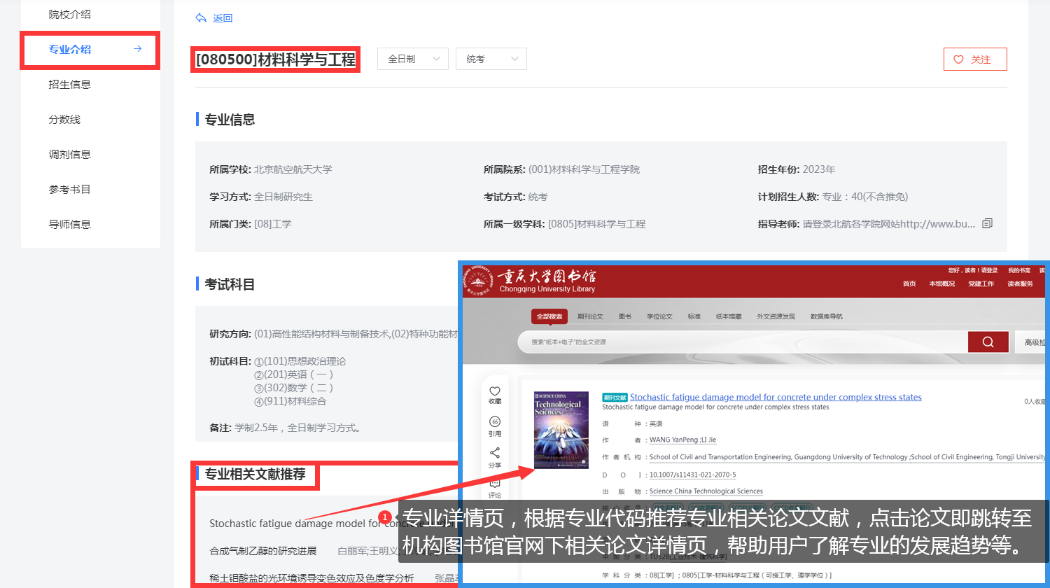 产品利用了维普的数据收集、数据整理、数据集成优势,通过维普考研服务平台与维普智慧图书馆知识库融合联动,为考研用户提供“信息服务”版块下“参考书目、专业文献、导师作品”的考研关联知识服务,支持用户点击相应栏目的链接跳转至图书馆知识库下的内容页面,拓展知识可以帮助用户查询了解有助于考研考试的学习书目,了解报考专业的未来发展趋势,了解专业导师的学术研究方向及学术成果等。