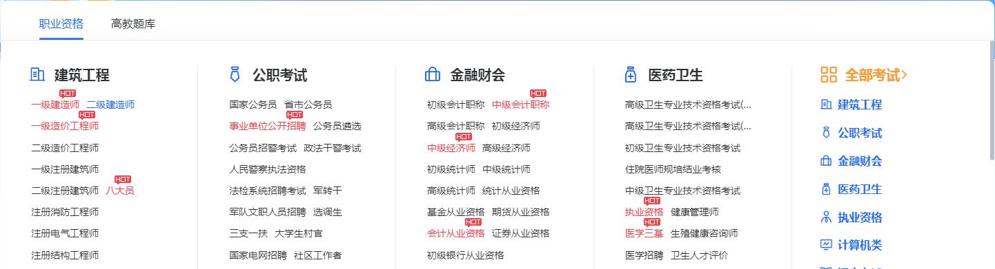 职业题库 包含公职考试、建筑工程、语言考试、金融财会、计算机类、医药卫生、研究生类、执业资格、综合技能、学历考试十大行业,超300个考试分类3000余门考试科目,共40余万套试卷,包含试题资源2400万余道;能够满足全行业门类、各知识领域用户的考试服务需求。