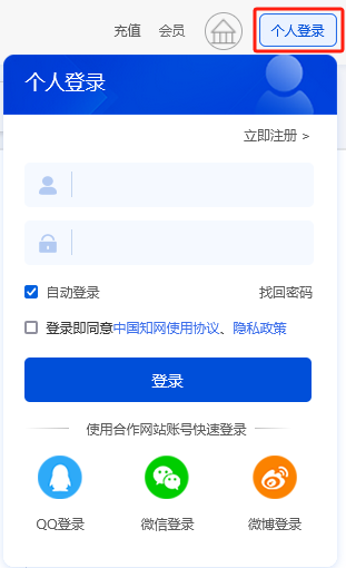 个人登录:点击通过账号密码、QQ、微信或微博登录。