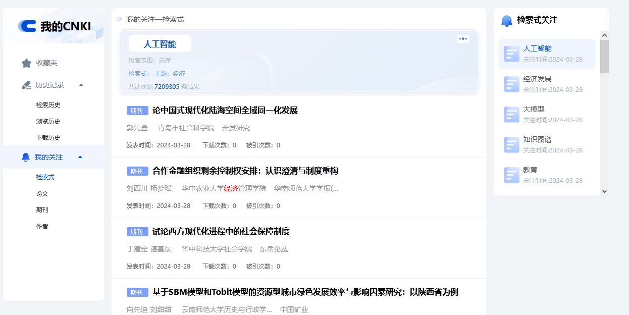 (2)使用我的CNKI提供的相关功能,例如检索结果的文献收藏与关注、历史记录的查看等。
