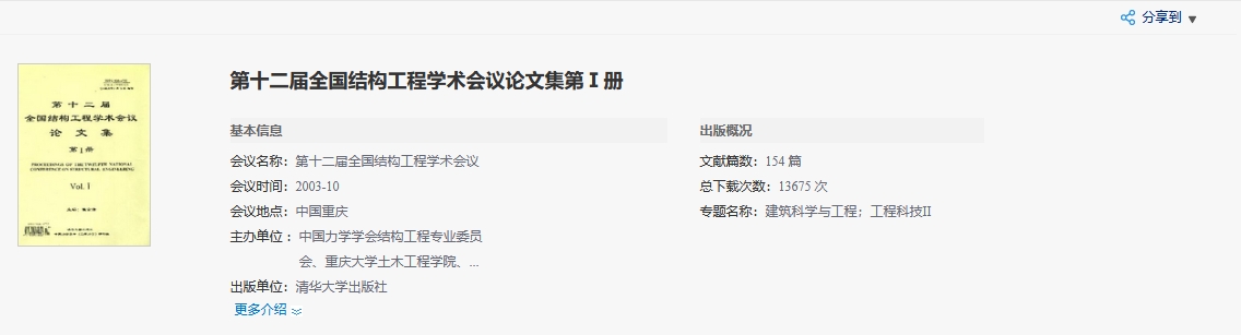 如图5.8.5.1所示,介绍信息包括基本信息、联系信息及出版概况,其中出版概况包括该报的文献篇数、总下载次数及被引次数。默认展示3行信息,点击“更多介绍”,可以查看全部信息。介绍信息右上方提供报纸的分享功能。