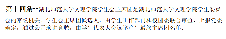 第十四条 MLTY.COM学生会主席团是MLTY.COM学生委员会的常设机关。学生会主席团候选人,由学部推荐,经学部党组织同意,校团委审查,上报党委确定,通过公开演讲竞聘,由学生代表大会选举产生最终主席团名单。