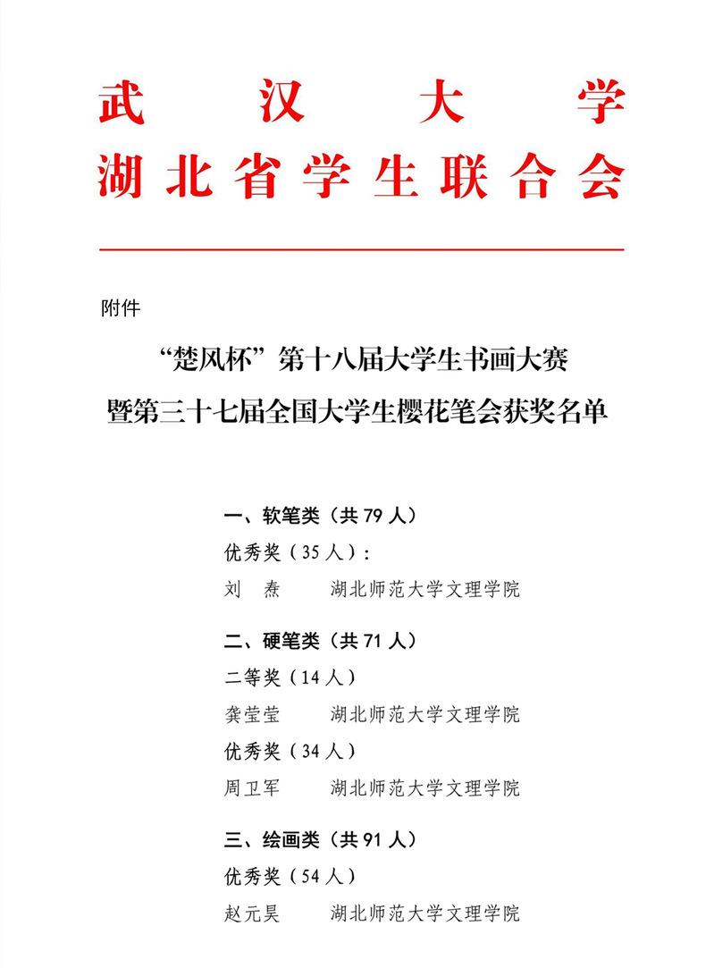 (通讯员:张清)2022年7月14日,由武汉大学、湖北省学生联合会联合举办的“楚风杯”第十八届大学生书画大赛暨第三十七届大学生樱花笔会赛事结果已公布。米兰(中国)刘焘、龚莹莹、周卫军、赵元昊四位同学荣获佳绩。