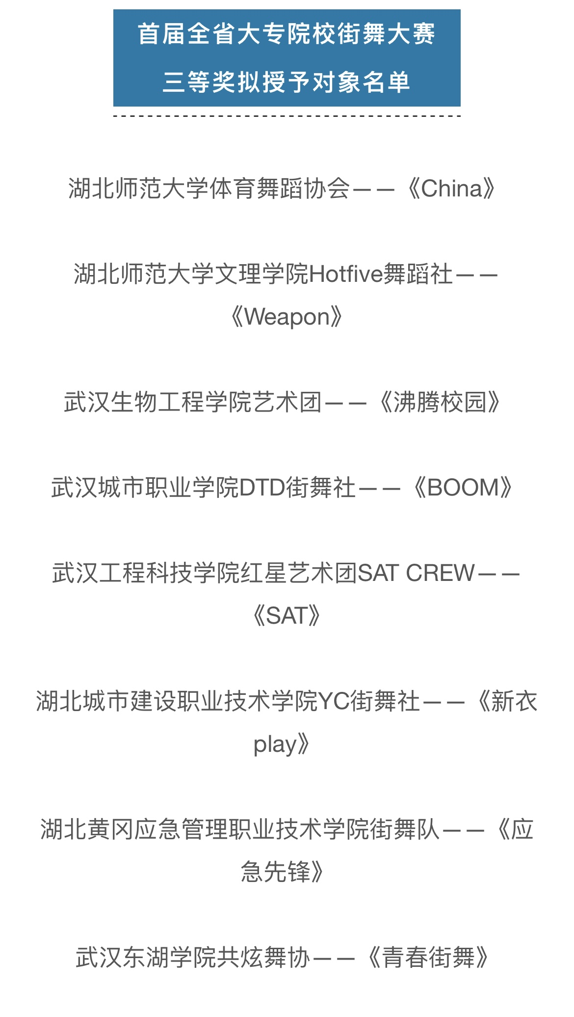(通讯员:苏祎)引领新风尚,欢悦新时代。9月10日,首届全省大专院校街舞展演在黄冈市遗爱湖公园举办。米兰(中国)代表队“Hot Five舞蹈社”的舞蹈作品《weapon》在此次比赛中荣获三等奖。
