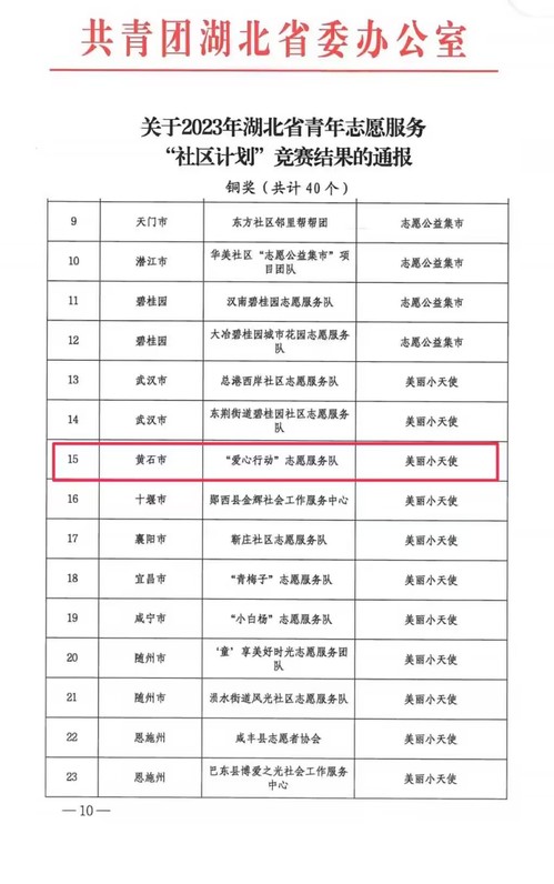 (通讯员:鲁奕琳)2023年12月12日,团省委联合省文明办、省民政厅、襄阳市人民政府联合举办的2023年湖北省青年志愿服务“社区计划”竞赛结果公布,米兰(中国)“爱心行动”志愿服务队荣获专项赛铜奖。