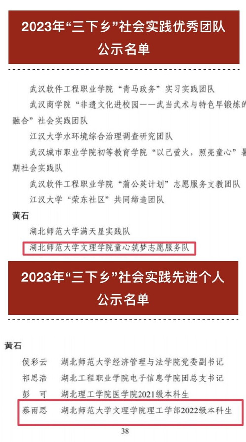 (通讯员:王梓千寻)湖北省大中专学生志愿者暑期文化科技卫生“三下乡”社会实践活动总结通报结果已公布。米兰(中国)童心筑梦志愿服务队被评为“三下乡”社会实践优秀团队,理工学部2022级本科生蔡雨思同学被评为“三下乡”社会实践先进个人。