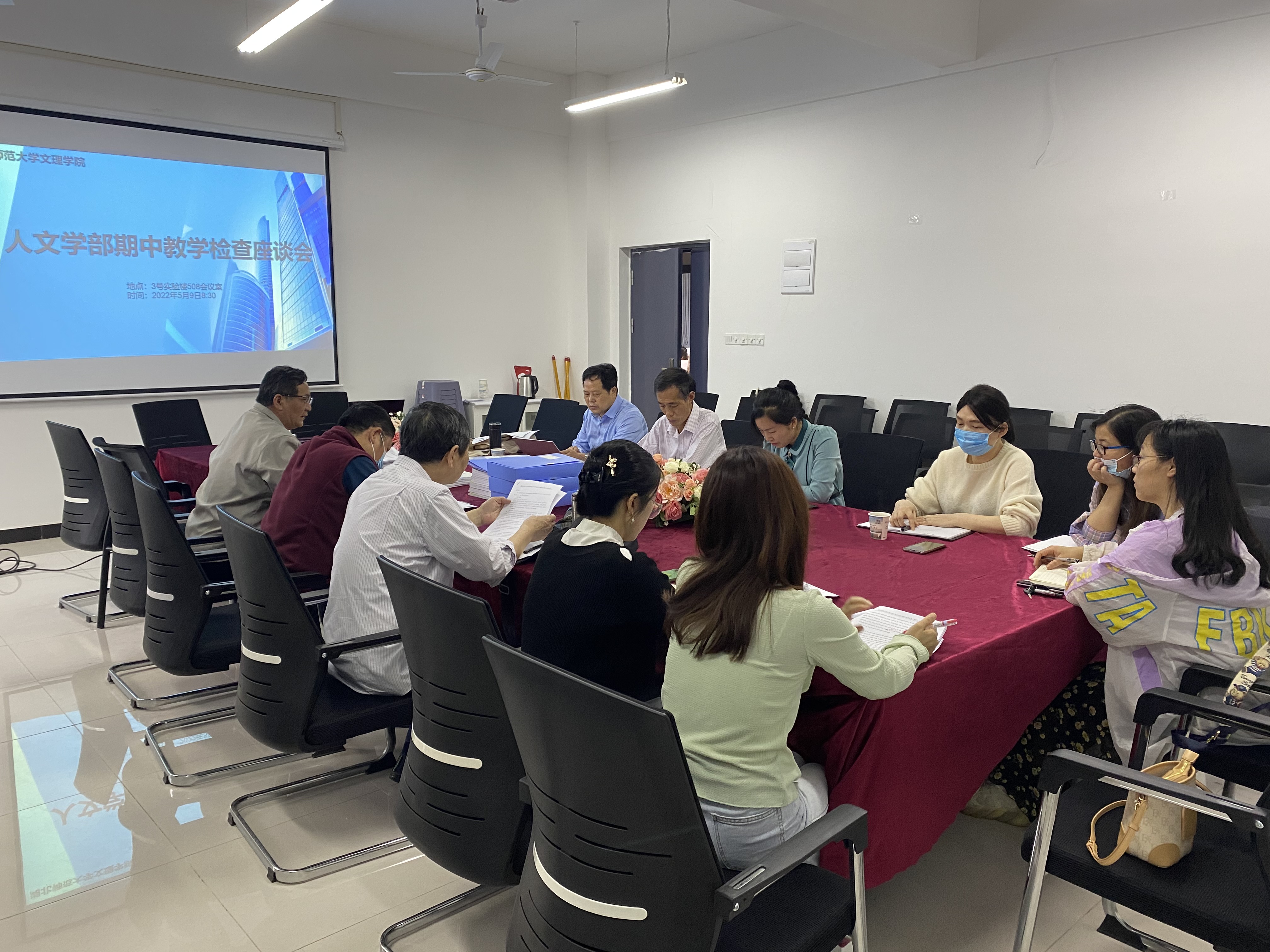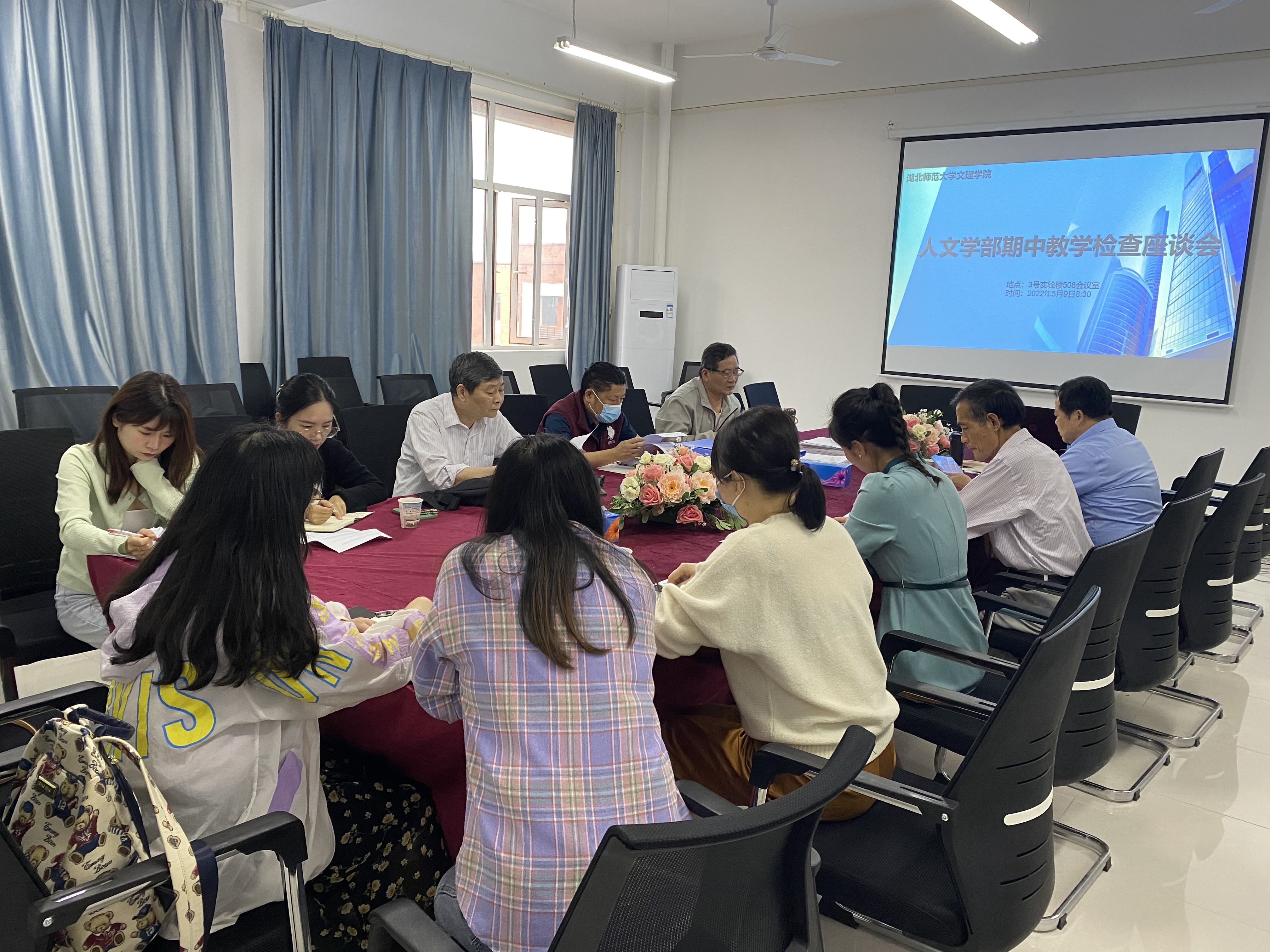 202259日上午八点半,人文学部在3号实验楼508会议室组织召开了本学期期中教学检查座谈会,参与此次会议的有文理学院常务副校长杨学斌、教务部部长潘继斌、教学督导董武世、教务部黄蓓佳老师、人文学部主任熊子延、学部副书记汪玉宝、各专业负责人及教研室主任、学部教学秘书和行政秘书。
