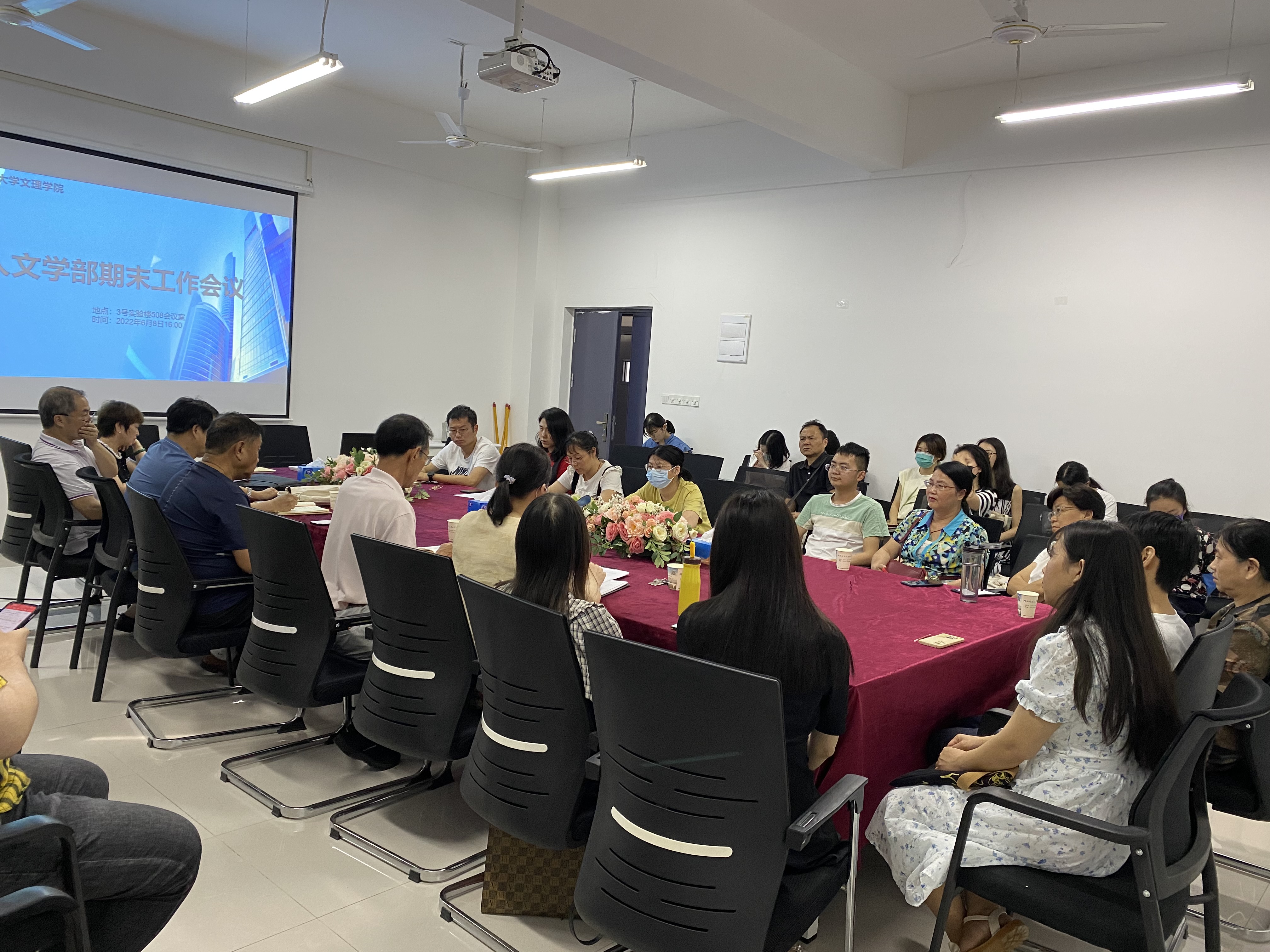 2022年6月8日下午四点,人文学部在3号实验楼508会议室召开了全体教职工期末工作会议,参加此次会议的有人文学部主任熊子延、学部副书记汪玉宝以及人文学部全体教职工。