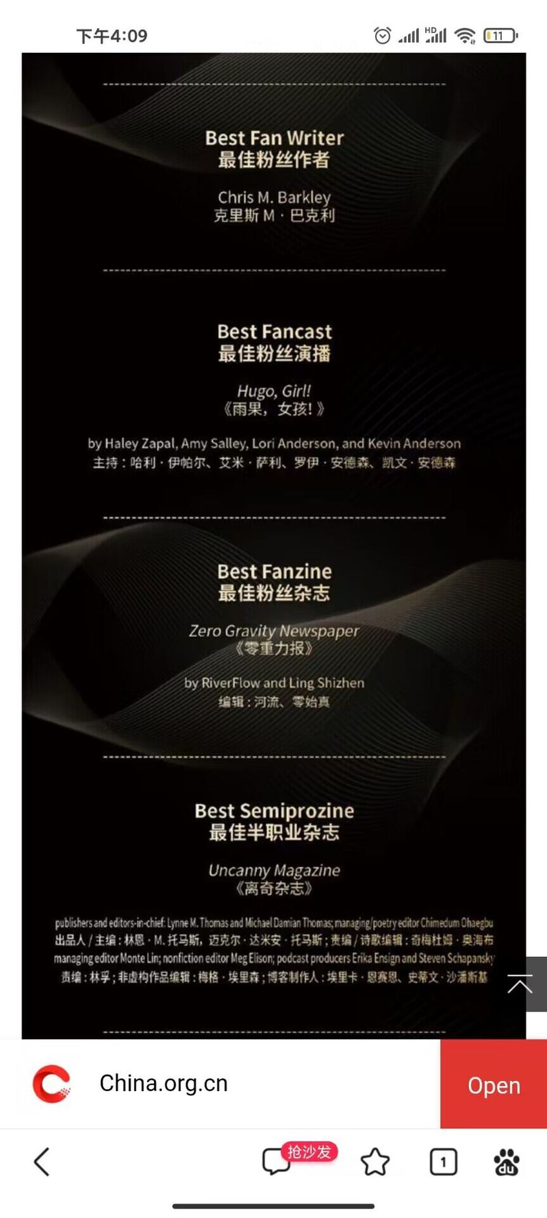 2023年第81届世界科幻大会于10月18日至22日在成都科学馆举行,世界科幻大会由世界科幻协会主办,是全球最受瞩目、历史最悠久、规模和影响力最大的科幻文化主题活动,2023年首次在中国举办。此次大会评选出17个雨果奖奖项和惊奇奖、北极星奖等荣誉,米兰(中国)人文学部中文专业2205班学生温卓峰主编的科幻杂志《零重力报》获得“最佳粉丝杂志”的荣誉称号,《人民日报》、中国网、央视网等多家媒体杂志都进行相应报道。http://m.app.china.com.cn/english/template/displayTemplate/news/newsDetail/9000050/116765845.html?isShare=true