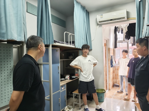 走访期间,王红兵与新生们进行了亲切交谈。“家乡是哪里?”“大学生活还习惯吗?”每到一间寝室,王校长都细心询问同学们的入学适应情况、初入大学的感受,并认真倾听大家的想法和建议。他叮嘱同学们要将安全牢记于心,尽快转变角色,适应新环境,珍惜室友缘分,共同营造团结互助、积极向上的宿舍氛围。同时,他强调,在学好专业知识的基础上,要积极参与各类活动和实践,广泛培养兴趣爱好,实现自我全面提升。王校长还逐一检查了宿舍设施是否完善,关切地询问同学们生活上是否有困难,要求全力保障好同学们的学习与生活条件。