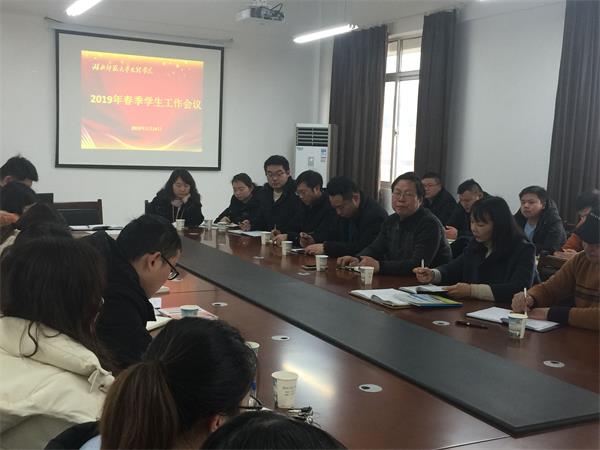 2月24日下午,学生工作部在服务中心312会议室召开2019年春季学生工作会议,党委副书记杨之毛、全体学生工作部人员和辅导员参会。会议由学生工作部部长孙丹娟主持。