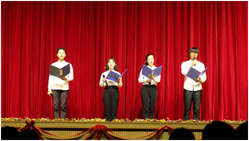 开场四位同学高声朗诵《我的祖国》,表达了强烈的爱国主义情怀,为模拟法庭的开始奠定情感基调!