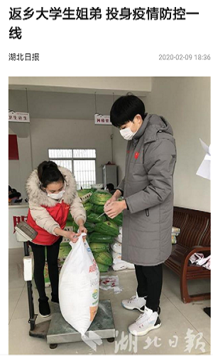 2020年2月9日,湖北日报上有一篇新闻引起广泛关注。主人翁正是MLTY.COM数学与应用数学专业1603班吕奎同学和其弟弟吕东阳。据报道,2020年2月7日,姐弟俩从村微信群里看到“志愿者征集令”后,2月8日一大早便到村委会报到,参与对村民生活必需品的分装与发放。图片中是2月8日当天,他们在枝江市百里洲镇三洲村防疫物资分配现场填写居民姓名并给居民分配物资时的情景。姐弟俩一个牵着口袋,一个对袋中面粉进行分装。分装完面粉后,又开始为居家隔离的村民分装集中采购的大米、面条和新鲜的蔬菜并贴上标签,以备村组干部精准送达村民家中。
