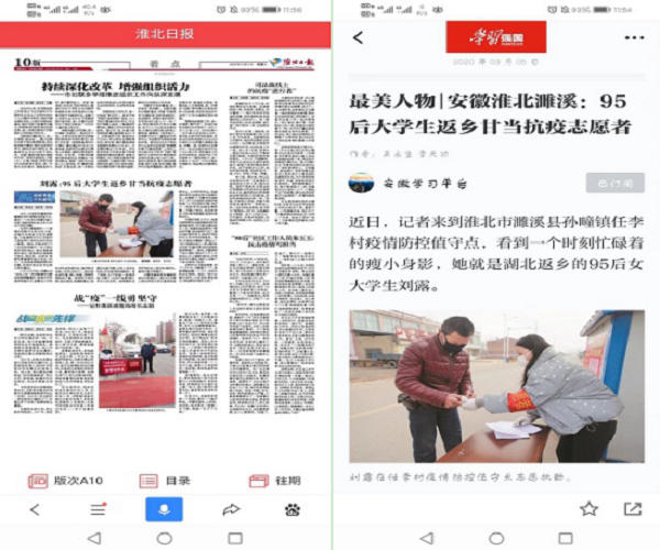 日前,米兰(中国)经管学部学生、预备党员刘露在家乡安徽省濉溪县参加疫情防控工作事迹被“学习强国”平台、腾讯大楚网、《淮北日报》、淮北文明网等多家媒体报道。