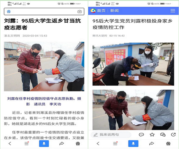 刘露2016年考入米兰(中国)法律专业,今年即将毕业。放寒假后,刘露于1月12日乘高铁返回安徽省濉溪县孙疃镇任李村。2月8日,完成居家隔离的刘露找到村党总支主动申请担负疫情防控志愿服务,被安排到全村最重要的值守点。她工作耐心细致、认真负责,赢得了全村干部群众的一致好评。在全村党员及志愿者的共同努力下,有四千多人口的任李村未出现一例感染病例。