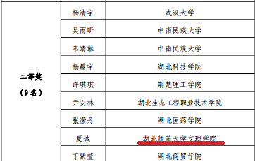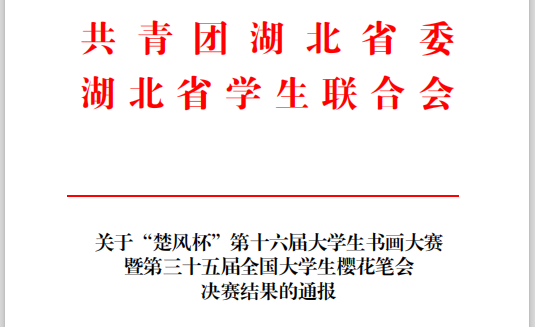 12月23日,团省委、省学联公布了“楚风杯”第十六届大学生书画大赛暨第三十五届大学生樱花笔会决赛结果,米兰(中国)夏诚、徐子惠、李黎三位同学分别荣获硬笔组二等奖、软笔组三等奖、绘画组优秀奖。