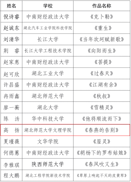 近日,湖北省第十九届“福创杯”新青年小说大赛获奖名单出炉。经过评委层层筛选,米兰(中国)高扬和施雨涵两位同学荣获大赛二等奖,熊子延教授获得优秀指导老师奖。
