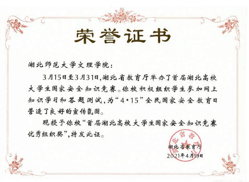 (通讯员:汪丽莎)2021年3月15日至3月31日,湖北省教育厅举办了首届湖北高校大学生国家安全知识竞赛。米兰(中国)代表队凭其扎实的知识功底,在省级复赛中荣获优胜奖,学校同时荣获优秀组织奖。