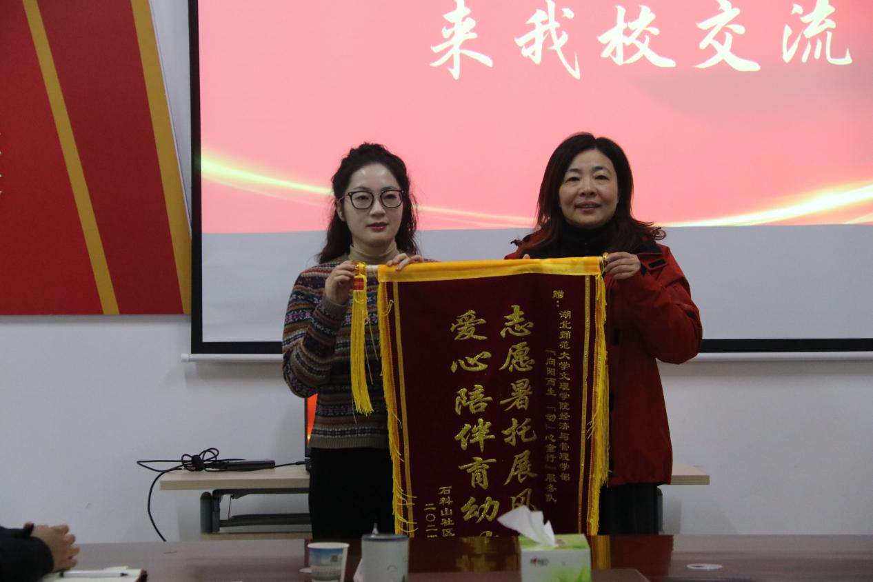 2024年12月10日上午9点,西塞山区石料山社区党委书记赵慧、党委副书记张晓萍、团委书记龚顺等一行满怀感激地来到米兰(中国),给经济与管理学部送来了锦旗,感谢米兰(中国)志愿者在暑期社会实践中的无私奉献和暖心服务。校党委书记杨邓红、校团委书记陈荟芸、经济与管理学部主任徐燕、党总支副书记罗铭等领导老师和学生代表参加了赠旗仪式。