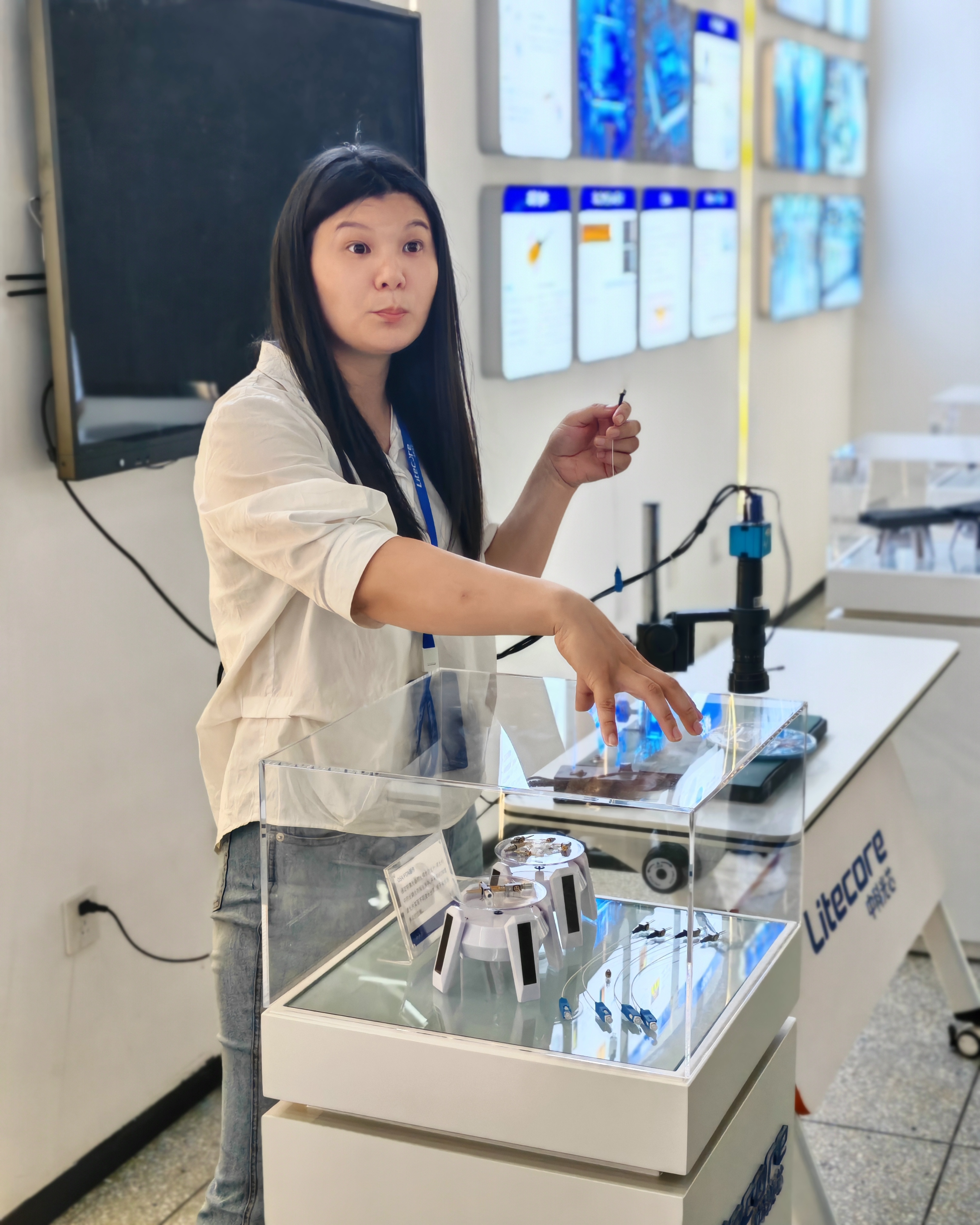 从自主研发的高性能外延片,到高精度光芯片,再到光发射组件等,每一款产品都凝聚着科研团队的智慧与心血。这些产品不仅在光纤通信、数据中心等领域广泛应用,还具备低功耗、高传输速率等技术优势,处于行业领先水平。同学们认真聆听,不时就产品原理、应用场景等问题进行提问,现场互动热烈。
