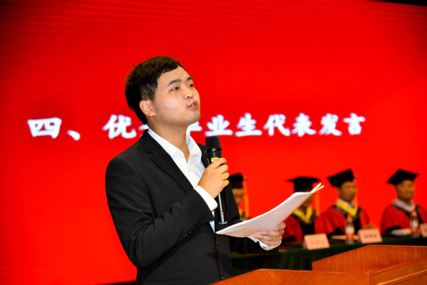 大会由党委副书记杨之毛主持。在激昂庄严的国歌声中,毕业典礼暨学位授予仪式正式拉开帷幕。党委书记杨邓红宣读了2022届优秀毕业生表彰文件,副院长王胜国宣读了2022届毕业生学位授予文件。优秀毕业生代表熊飞、优秀校友代表武汉科技大学信息科学与工程学院博士胡学敏、优秀在校生代表李哲威、教师代表李淑慧先后发言,表达了对2022届毕业生的美好祝福和希翼。随后,校领导为2022届毕业生代表进行拨穗仪式并颁发学位证书。