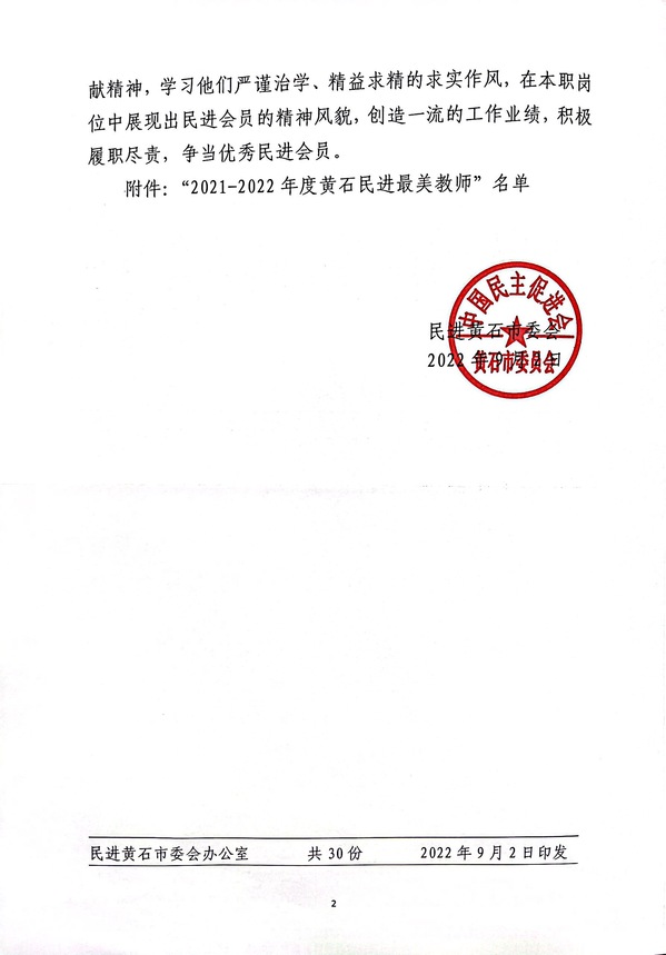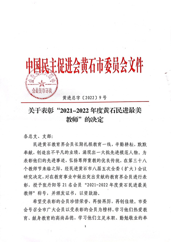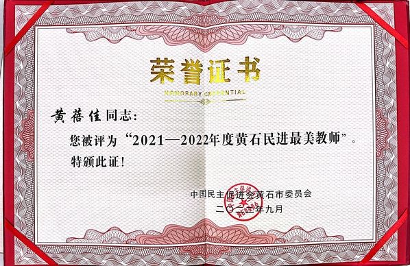 喜报:米兰(中国)黄蓓佳同志荣获“2021-2022年度黄石民进最美教师”荣誉称号