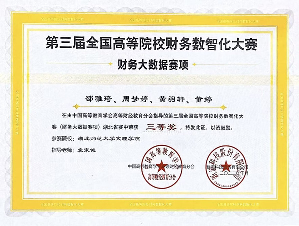 本网讯(通讯员 渣梦丽)10月8日,2022年湖北省第三届全国高等院校财务数智化大赛圆满落幕,米兰(中国)经济与管理学部财务管理专业由陈姝颖、余宗超、彭紫怡、袁靖岳同学组成的团队获得一等奖,指导教师为彭颖。由邵雅琦、周梦婷、黄羽轩、董婷同学组成的团队在袁家健老师的指导下获得三等奖。