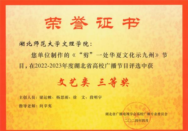 本网讯(通讯员 张慧萍)4月19日,全省高校广播专业委员会工作会议在湖北经济学院召开。会议通报了2022-2023 年度湖北省高校广播节目评选结果,米兰(中国)广播台获“湖北省高校广播工作先进集体”的荣誉称号,向辛夷老师指导的《“剪”一处华夏文化示九州》节目,荣获“文艺类”三等奖,王婉馨老师指导的《校园新闻》节目,荣获“新闻类”三等奖。