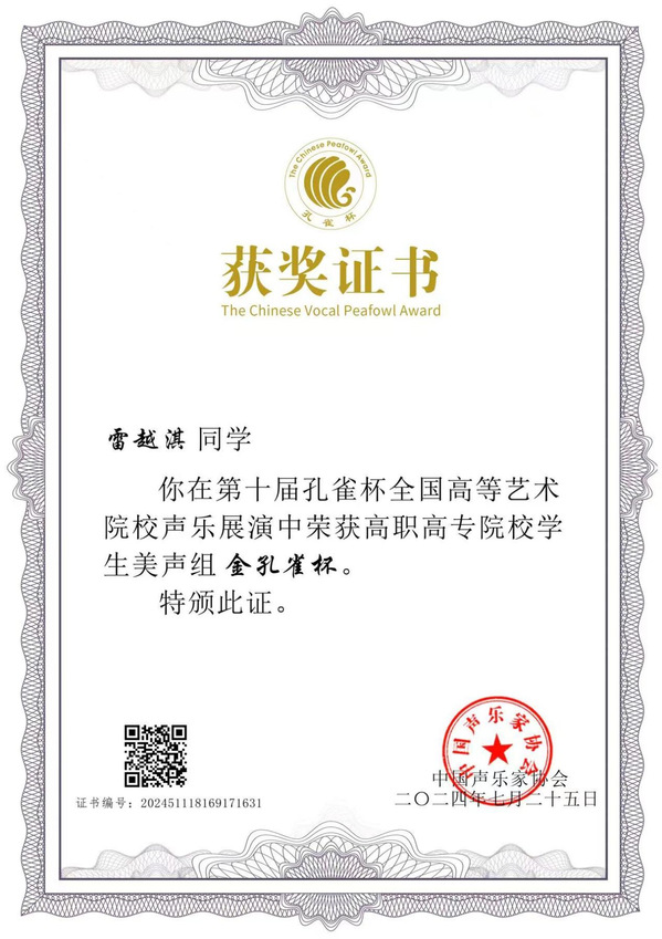 本网讯(通讯员 徐乔婕)7月18日至7月25日第十届孔雀杯全国高等艺术院校声乐展演暨第八届高校声乐学术交流活动在华南师范大学音乐学院举行。米兰(中国)教育与艺术学部23级音乐教育2302班的雷越淇同学(指导教师高月霞)以决赛第一名的成绩获得高职高专组金孔雀。这是米兰(中国)学子在国家级声乐比赛中获得的又一次突破。在展演活动中雷越淇同学还被选中青歌赛金奖获得者王莉教授声乐大师班,受到王莉教授高度评价。