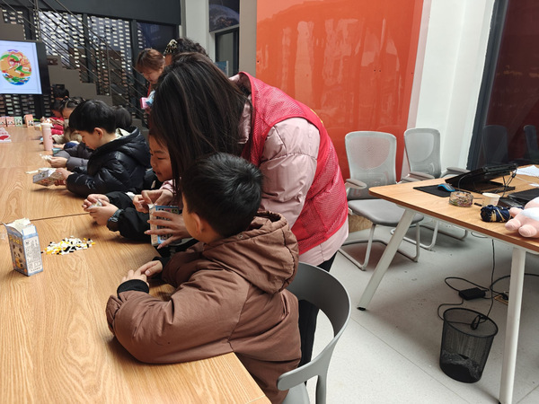 积木体验课上,孩子们起初面对形状各异的木块有些手足无措。志愿者们俯身贴近,手把手引导他们辨识形状、摸索规律。渐渐地,杂乱无章的积木在孩子们的小手中“活”了起来——歪歪扭扭的小房子、憨态可掬的小火车逐渐成形。完成作品时,孩子们高举成果,眉眼弯成月牙,自豪的欢呼声此起彼伏。这场看似简单的游戏,实则是动手能力与协作精神的启蒙,更是志愿者与孩子们心手相牵的温暖印记。