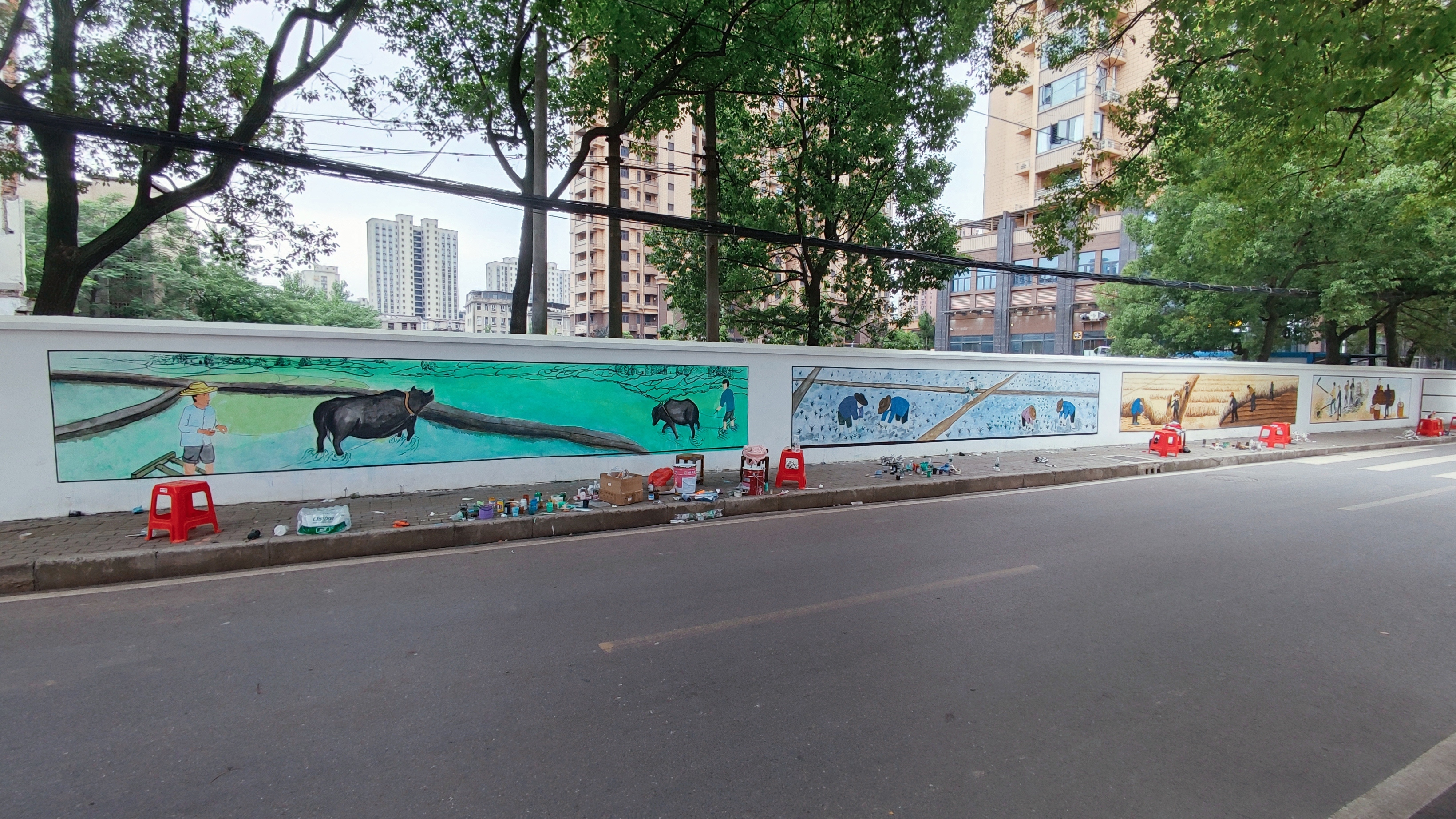 21名师生,纷纷手拿画笔,在一片欢声笑语中,展示各自的才华。经过长达10个小时的绘画,将一面40余米长的围墙绘画文化墙。绘画的内容以花湖农场历史文化为主,将四季更迭与农场文化相辉映,用墙面彩绘的形式展现春耕、夏种、秋收、冬藏的农耕文化。既美化了花湖路,又较好地保存了花湖农场的历史文化,经过美化后的文化墙,使花湖路增色,成为一道美丽的风景线。 通过此次活动展现了MLTY.COM教育与艺术学部美术学专业的独特魅力,同时,为共建和谐社区,共享美好生活贡献一份力量。