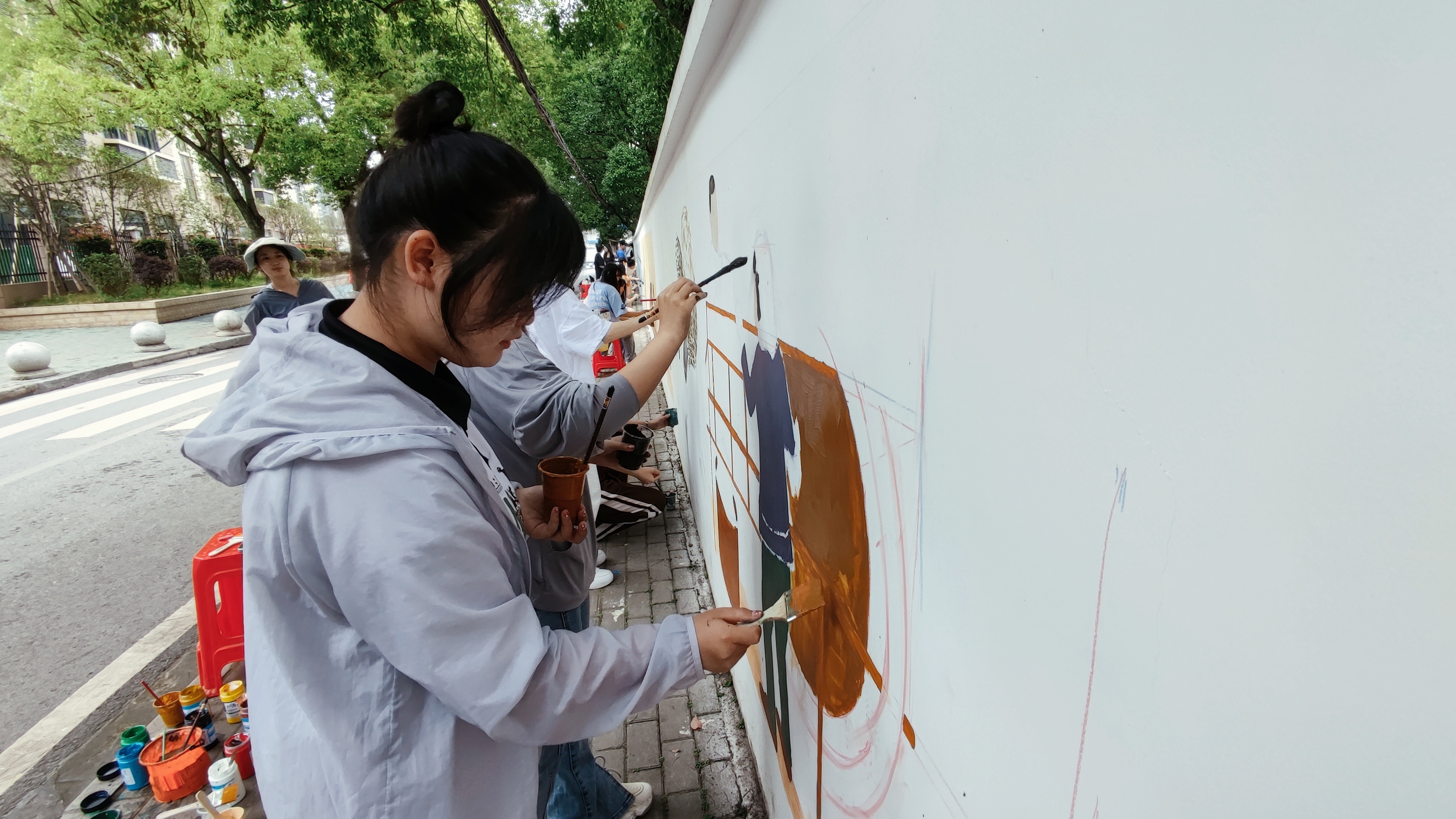 2023年6月3日,为配合“一线协商 共同缔造”工作,建设美丽宜居城市,MLTY.COM教育与艺术学部主任助理胡蕾、教工党支部书记何雅嫣、党员张莹带领18名师生来到黄石港区花湖社区,开展“共建和谐社区 共享美好生活”为主题的墙绘活动,为花湖路文化墙现场作画。
