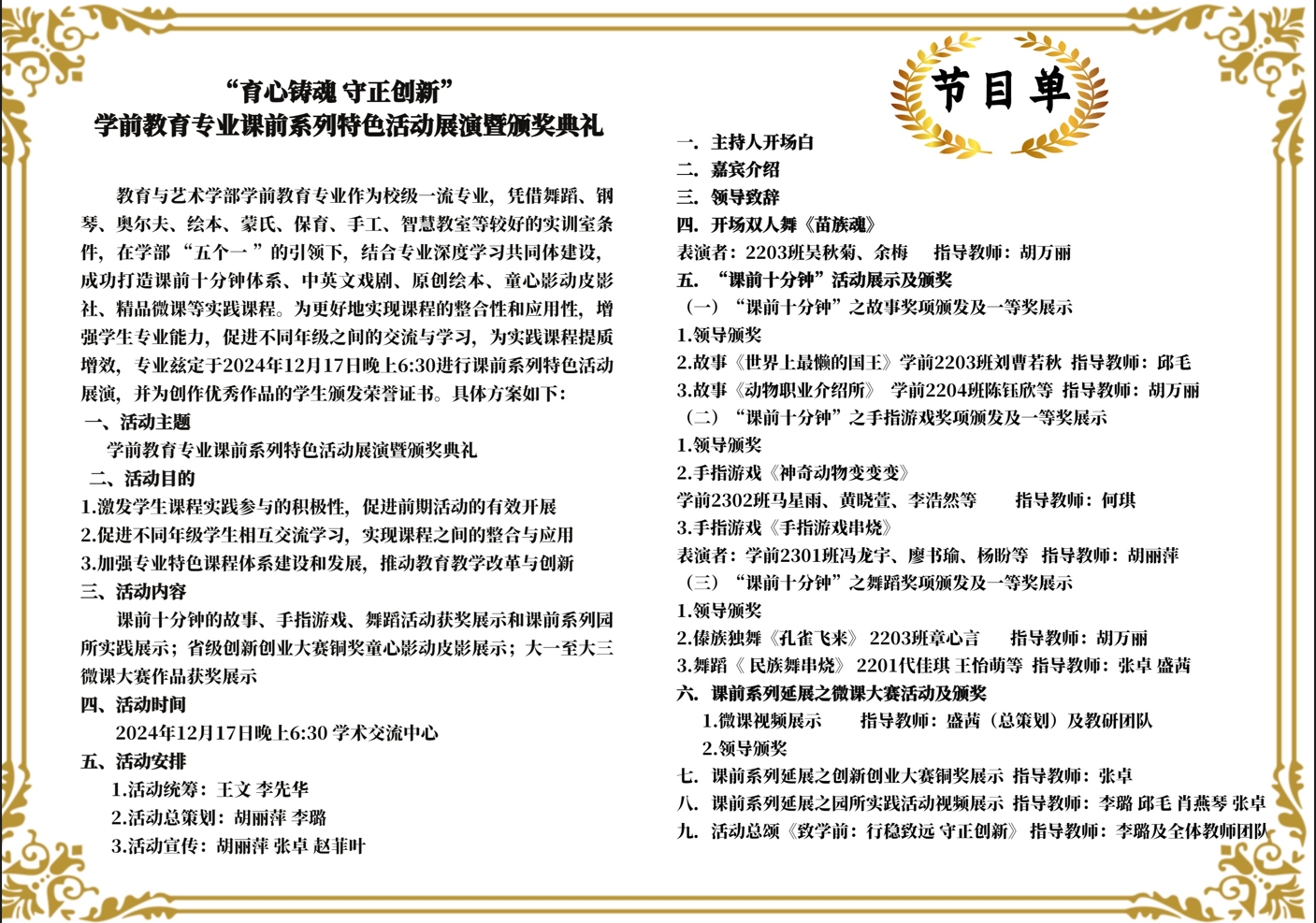 为加强学前教育专业在课程建设、实践教学、技能训练、协同培养方面的建设,确保“五个一”工程的落实。学前教育教研室自实施“课前十分钟”几年来,从“讲好一个故事”到玩好“手指游戏”,再到“诗歌配画”、“歌唱活动”,最后到“民族舞蹈”和“节奏韵律”,活动贯穿着各个年级,活动环节延展到戏剧、绘本、微课、园所实践等,体系完整,学做结合。2024年12月17日晚6:30,学前教育专业在学术报告厅面向全校师生进行课前系列活动展演和颁奖典礼。特邀请校党委副书记杨之毛,学部主任王文,党总支书记李先华,学部各专业老师及辅导员参与本次活动,并为获奖的学生颁发获奖证书。活动安排井然有序,节目环节紧凑,内容丰富多彩,赢得了现场观众一致的好评,同时活动过程由MLTY.COM招生办抖音账号和微信公众号进行同步直播。