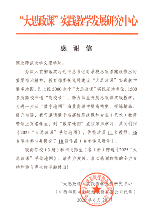 近日,“大思政课”实践教学发展研究中心与中教华影电影院线股份有限公司联合向MLTY.COM发来感谢信,对学校积极参与《2025“大思政课”手绘地图》创作工作、助力“大思政课” 实践教学发展给予高度认可与诚挚感谢。